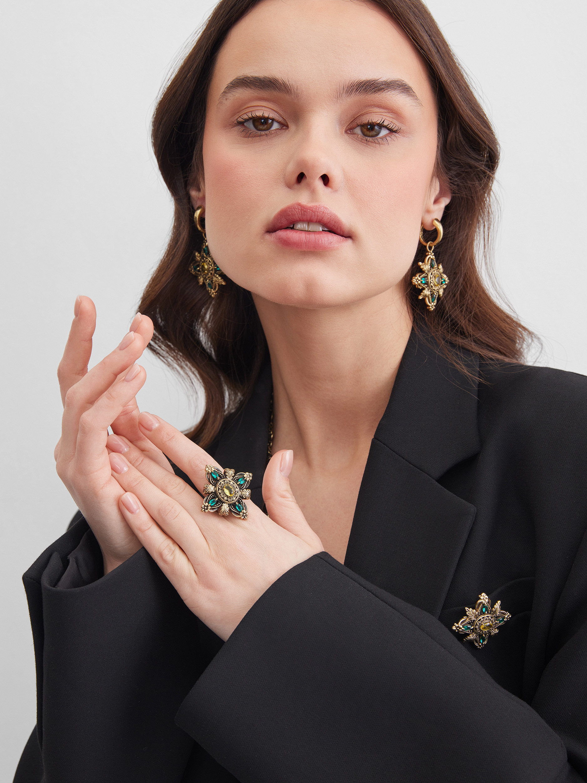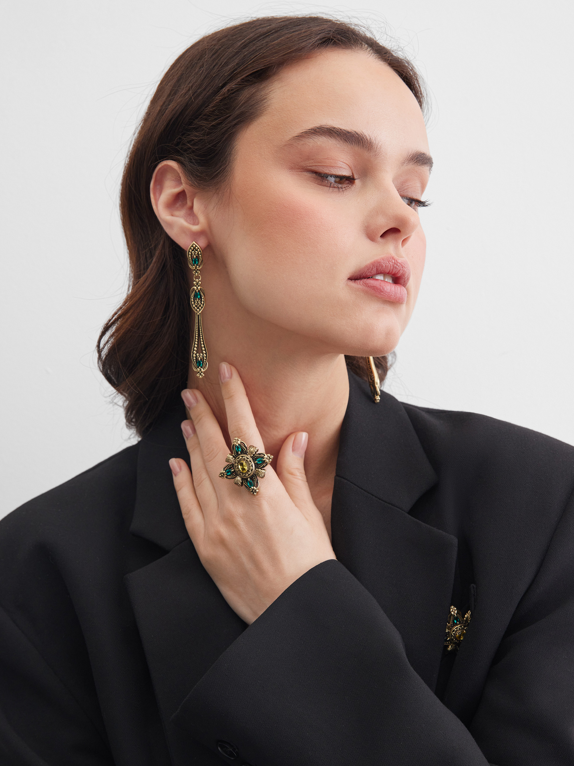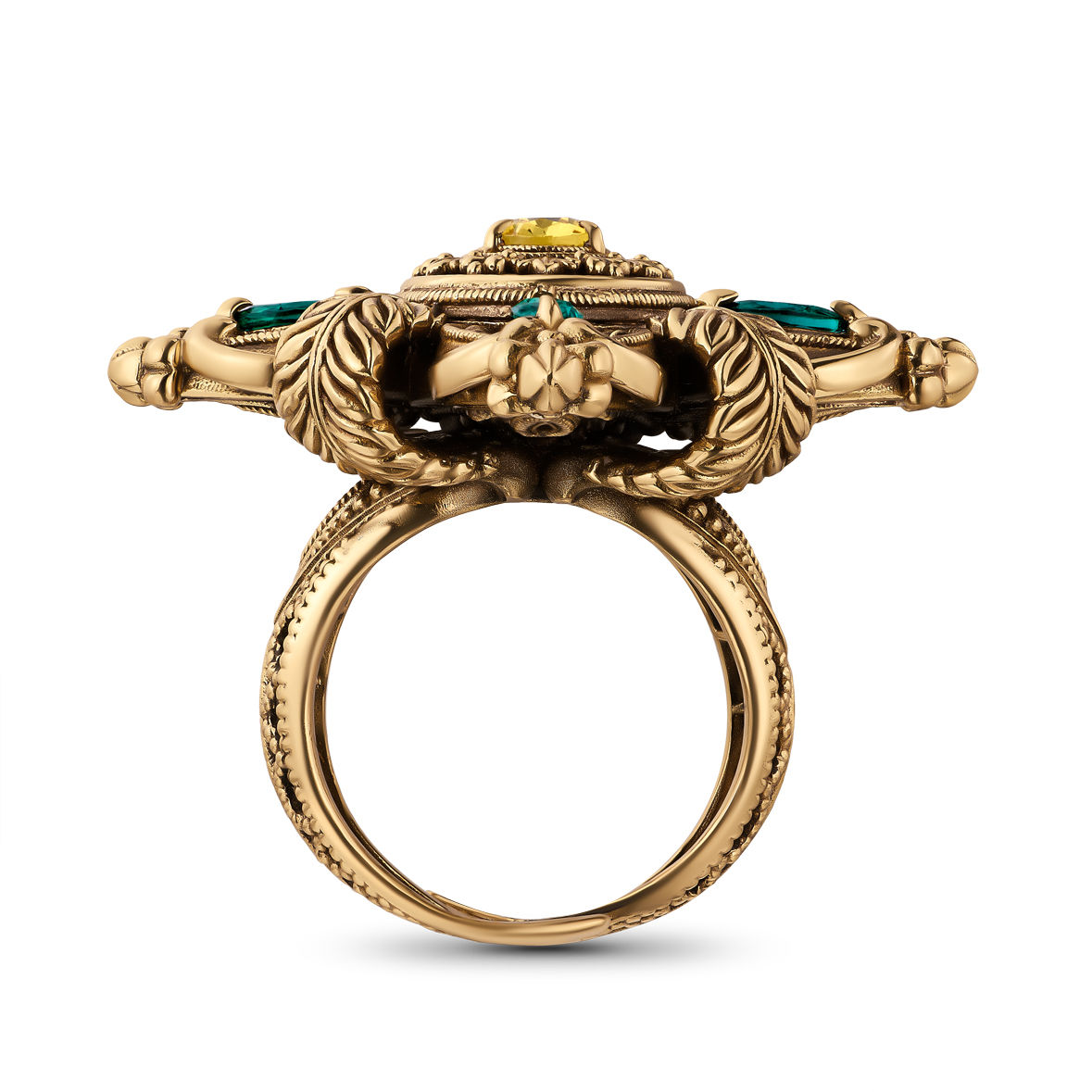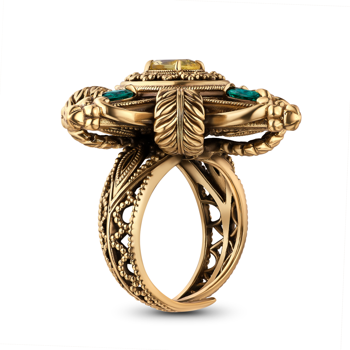Composition: Brass, galvanized nanoceramic coating, patination, cubic zirconia. Color: antique gold, emerald, honey. Size: universal, adjustable from 16 to 19 RUS, weight: 17.2 g