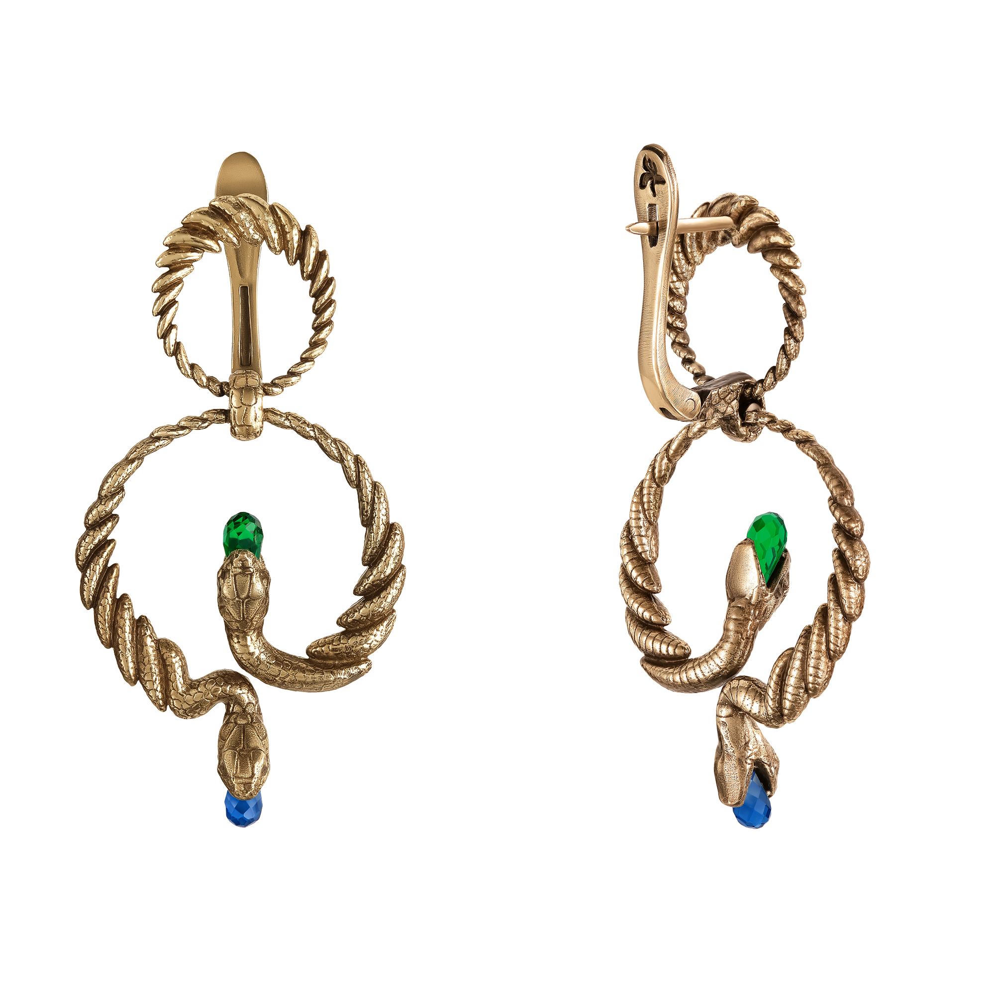 Earrings handmade SERPENTI. Italian design. Snakes tamed in earrings are considered a real must-have for every sophisticated jewelry lover. Snakes are a talisman filled with secret meaning and endowed with protective energy properties. Composition: Brass (brass) with galvanic coating, briolette-cut cubic zirconias. Size: height 5 cm, clasp - English lock. Weight 12.5 gr. for a couple.